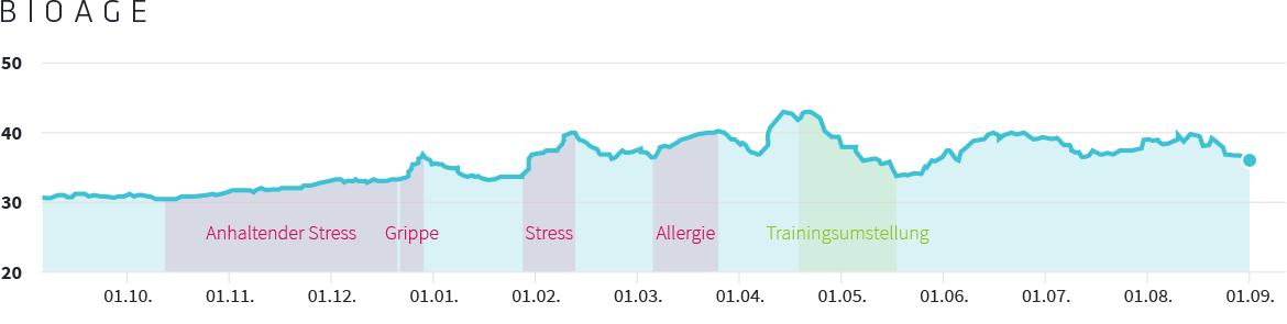 "Debido a mi avanzada edad biológica, me pasé a los entrenamientos de resistencia. También presté atención a mis hábitos de sueño y me acosté más temprano. Empecé este cambio a mediados de diciembre - el Vitalmonitor me muestra claramente mi éxito. Ahora he reducido mi edad biológica en 26 años."