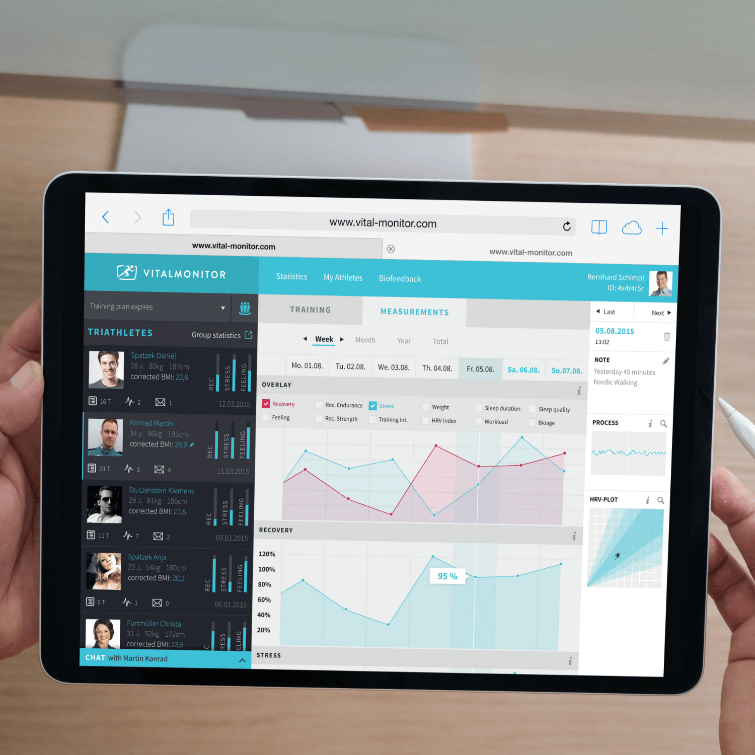 "Durch den Vitalmonitor kann ich die Belastungen aus Sport, Studium und Alltag sowohl kurzfristig als auch langfristig sehr gut erkennen und mein Training entsprechend anpassen. In Zeiten großer Herausforderungen oder auch bei extremen Bedingungen wie bei Hitzeperioden ist der Körper oft bereits an den Grenzen seiner Regenerationsfähigkeit. Subjektiv habe ich dies oftmals erst 2-3 Tage später erkannt, indem ich anschließend in ein Tief gefallen bin. Mit dem Vitalmonitor kann ich dies nun verhindern. Mit Hilfe der zeitnahen Messungen erhalte ich eine sofortige objektive Rückmeldungüber meinen aktuellen Regenerationsstatus. Durch rechtzeitige Trainingsanpassungen vermeide ich nun solche Tiefs und kann dadurch konstant Leistung aufbauen."